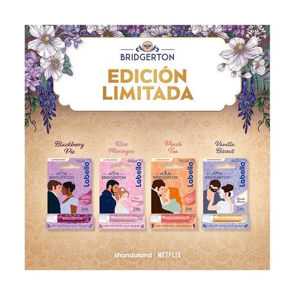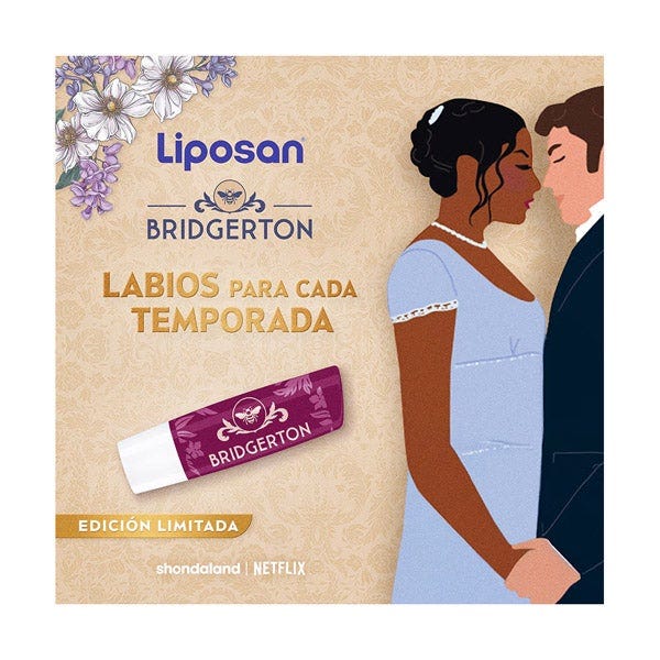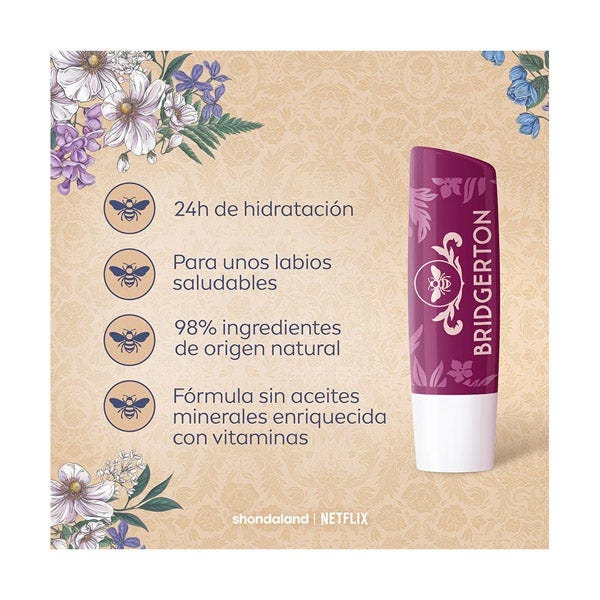 El Bálsamo Labial 24h Hidratación Liposan Bridgerton es una edición limitada inspirada en el universo elegante y romántico de la serie. Su fórmula proporciona hidratación continua durante 24 horas, manteniendo los labios suaves, protegidos y con un aspecto saludable durante todo el día.