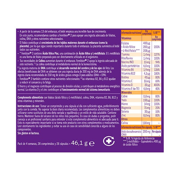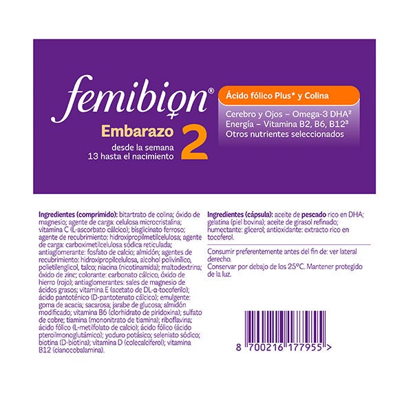 Comprimido: Bitartrato De Colina; Óxido De Magnesio; Agente De Carga: Celulosa Microcristalina; Vitamina C (L-Ascorbato Cálcico); Bisglicinato Ferroso; Agente De Recubrimiento: Hidroxipropilmetilcelulosa; Agente De Carga: Carboximetilcelulosa Sódica Reticulada; Antiaglomerante: Fosfato De Calcio; Almidón; Agentes De Recubrimiento: Hidroxipropilcelulosa, Alcohol Polivinílico, Polietilenglicol, Talco; Niacina (Nicotinamida); Maltodextrina; Óxido De Zinc; Colorante: Carbonato Cálcico, Óxido De Hierro (Rojo); Antiaglomerantes: Sales De Magnesio De Ácidos Grasos; Vitamina E (Acetato De DL-α-Tocoferilo); Ácido Pantoténico (D-Pantotenato Cálcico); Emulgente: Goma De Acacia; Sacarosa; Jarabe De Glucosa; Almidón Modificado; Vitamina B6 (Clorhidrato De Piridoxina); Sulfato De Cobre; Tiamina (Mononitrato De Tiamina); Riboflavina; Ácido Fólico (L-Metilfolato De Calcio (Metafolin)); Ácido Fólico (Ácido Pteroilmonoglutámico); Yoduro Potásico; Seleniato Sódico; Biotina (D-Biotina); Vitamina D (Colecalciferol); Vitamina B12 (Cianocobalamina). Cápsula: Aceite De Pescado Rico En DHA; Gelatina (Piel Bovina); Aceite De Girasol Refinado; Humectante: Glicerol; Antioxidante: Extracto Rico En Tocoferol