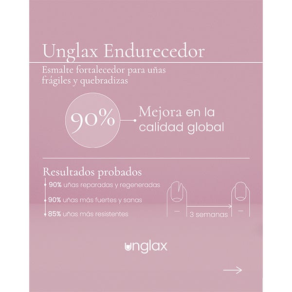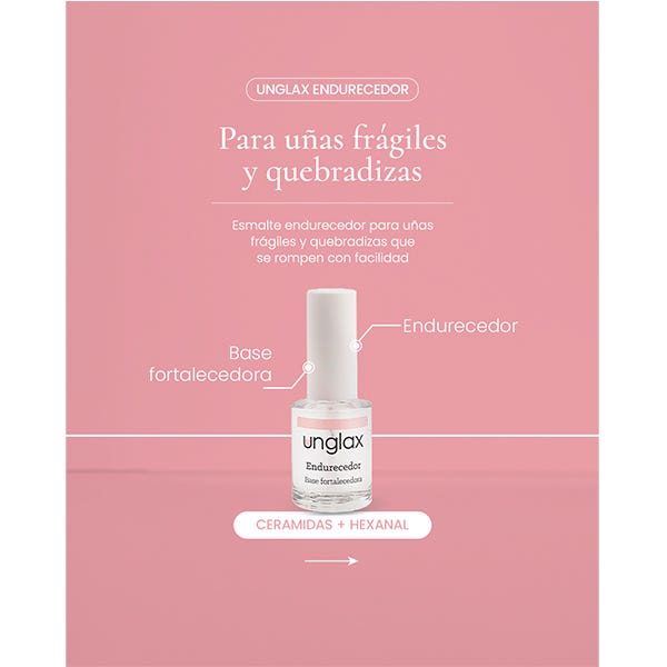 Unglax Endurecedor es un esmalte fortalecedor para uñas frágiles y quebradizas que se rompen con facilidad. Su principio activo, las ceramidas, proporciona resistencia y protección extrema a la estructura ungueal y respeta la hidratación natural de las uñas.
