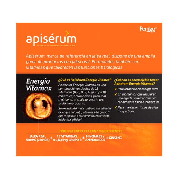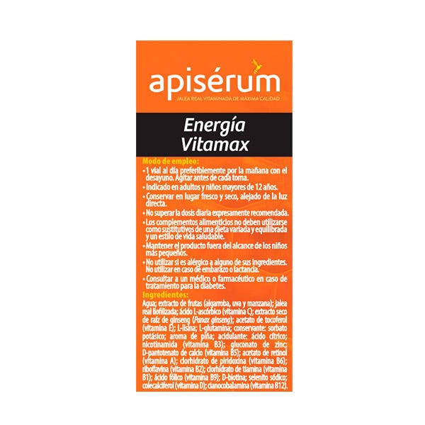 Apiserum Energía Vitamax es una combinación única de vitaminas, minerales, aminoácidos, jalea real y ginseng, que aportan una acción energizante.