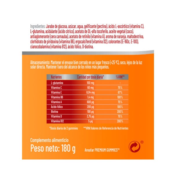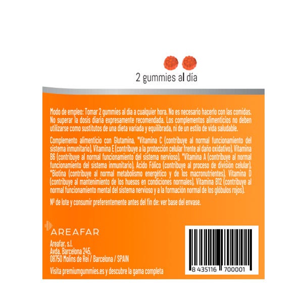 Complemento alimenticio con Glutamina, Vitamina C (contribuye al normal funcionamiento del sistema inmunitario), Vitamina E (contribuye a la protección celular frente al daño oxidativo), Vitamina B6 (contribuye al normal funcionamiento del sistema nervioso), Vitamina A (contribuye al normal funcionamiento del sistema inmunitario), Ácido Fólico (contribuye al proceso de división celular), Biotina (contribuye al normal metabolismo energético y de los macronutrientes), Vitamina D (contribuye al mantenimiento de los huesos en condiciones normales), Vitamina B12 (ccontribuye al normal funcionamiento mental del sistema nervioso y a la formación normal de los glóbulos rojos).