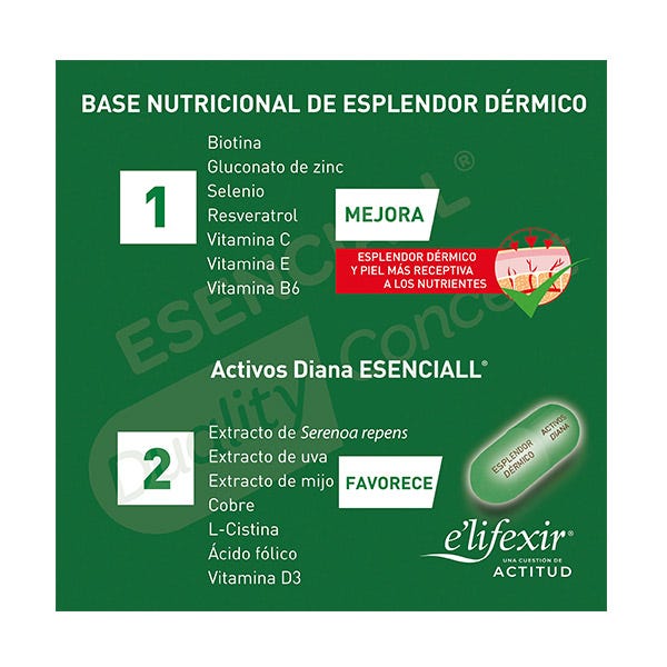 2. Activos Diana ESENCIALL: Extracto de Serenoa repens, Extracto de uva, Extracto de mijo, Cobre, L Cistina, Ácido fólico y Vitamina D3.