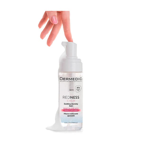 REDNESS Espuma Limpiadora Calmante está especialmente diseñada para pieles sensibles, propensas a la cuperosis, arañas vasculares, eritema o rosácea.