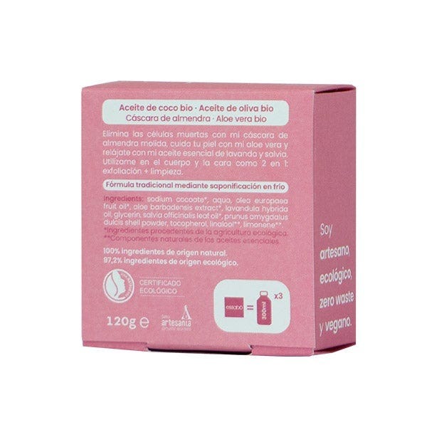 Essabó Exfoliante es un jabón de baño formulado para exfoliar naturalmente la piel, gracias a la cáscara de almendra molida y al aloe vera orgánico. Su base está elaborada con aceite de coco y con aceite de oliva ecológicos. Elaborado artesanalmente mediante saponificación tradicional en frío. Idóneo para todo tipo de pieles.