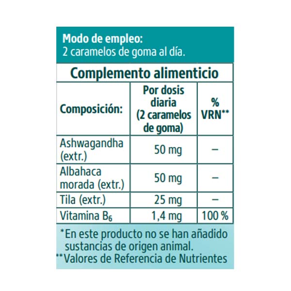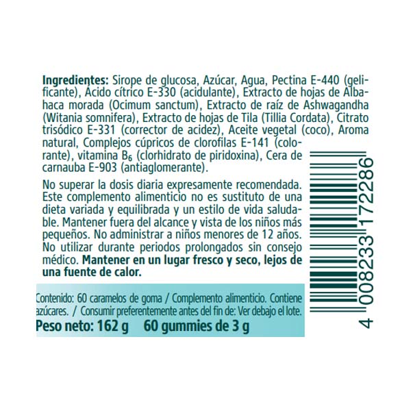 Ingredientes: Sirope de glucosa, Azúcar, Agua, Pectina E-440 (gelificante), Ácido cítrico E-330 (acidulante), Extracto de hojas de Albahaca morada (Ocimum sanctum), Extracto de raíz de Ashwagandha (Witania somnifera), Extracto de Tilia cordata, Citrato trisódico E-331 (corrector de acidez), Aceite vegetal (coco), Aroma natural, Complejos cúpricos de clorofilas E-141 (colorante), vitamina B6 (clorhidrato de piridoxina), Cera de carnauba E-903 (antiaglomerante).