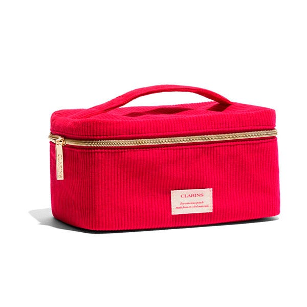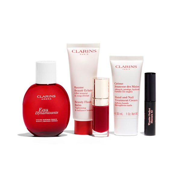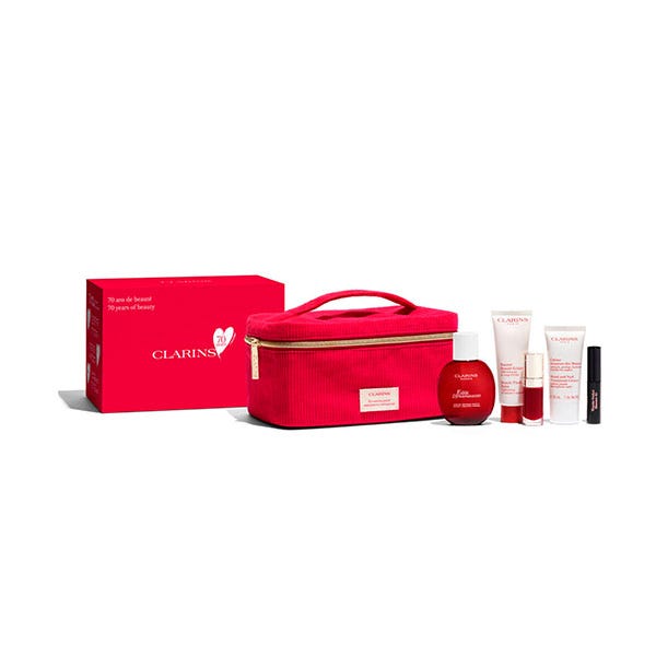También incluye nuestro icónico Lip COmfort Oil en el tono 03, la crema de manos en formato 30ml, la máscara de pestañas Wonder Perfect 4D en tamaño mini y el estuche rojo por los 70 años de Clarins.