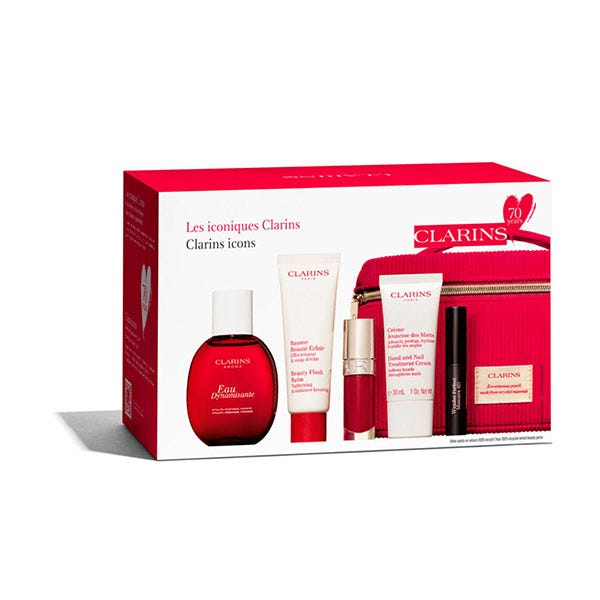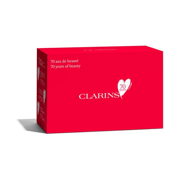 Cofre para celebrar los 70 años de Clarins. Se compone de Eau Dynamisante, un agua de tratamiento con un perfume vigorizante que cuida la piel y la mente, Beauty Flash Bam que devuelve la luminosidad a la piel, atenúa los signos del cansancio, a la vez que tensa los rasgos visiblemente.