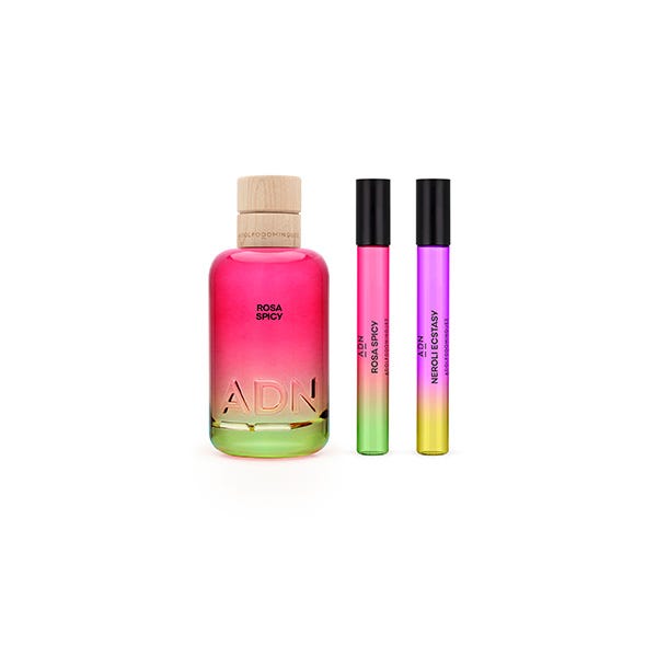 Composición del estuche: Rosa Spicy Eau de Parfum vaporizador 100ml + Rosa Spicy Eau de Parfum formato viaje 10ml + Neroli Ecstasy Eau de Parfum formato viaje 10ml.