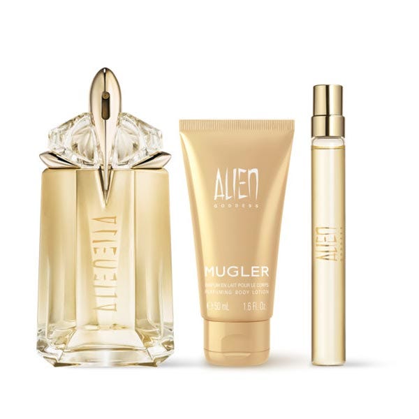 Alien Goddess Eau de Parfum 60 ml recargable y tamaño viaje 10 ml: un perfume de mujer que es una promesa sagrada de feminidad y esperanza. En una época en la que la gente busca la luz en la oscuridad, una diosa solar allana el camino hacia un destino milagroso pero auténtico. La mujer que lleva Alien Goddess Eau de Parfum está en perfecta armonía con su cuerpo y su alma. Un resplandor solar místico e incandescente la rodea, realzado por notas chispeantes de bergamota, jazmín Grandiflorum y vainilla Bourbon, está dispuesta a llenar el mundo que la rodea de generosidad y benevolencia.