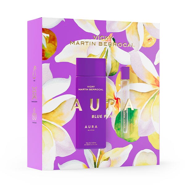 Aura es una fragancia brillante e irresistible. Notas de pera y flor de naranjo se unen a una chispeante pimienta negra y lirio de los valles. El fondo se revela con una envolvente base de vainilla, haba tonka y almizcle.