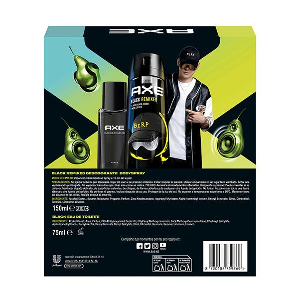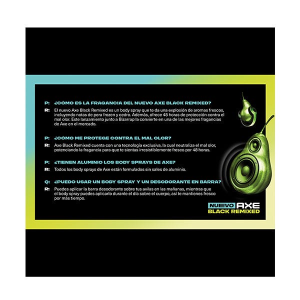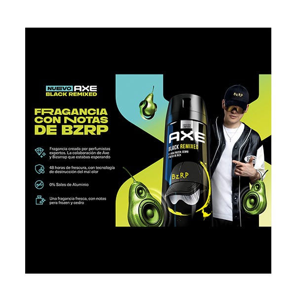 AXE BLACK REMIXED DESODORANTE BODY SPRAY BZRP: Huele irresistiblemente fresco con el nuevo AXE BLACK REMIXED: una fragancia con notas de BZRP. El nuevo Axe Black Remixed es un body spray que te da una explosión de aromas frescos, incluyendo notas de pera frozen y cedro. Además, ofrece 48 horas de protección contra el mal olor. Este lanzamiento junto a Bizarrap la convierte en una de las mejores fragancias de Axe en el mercado.