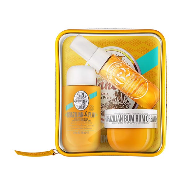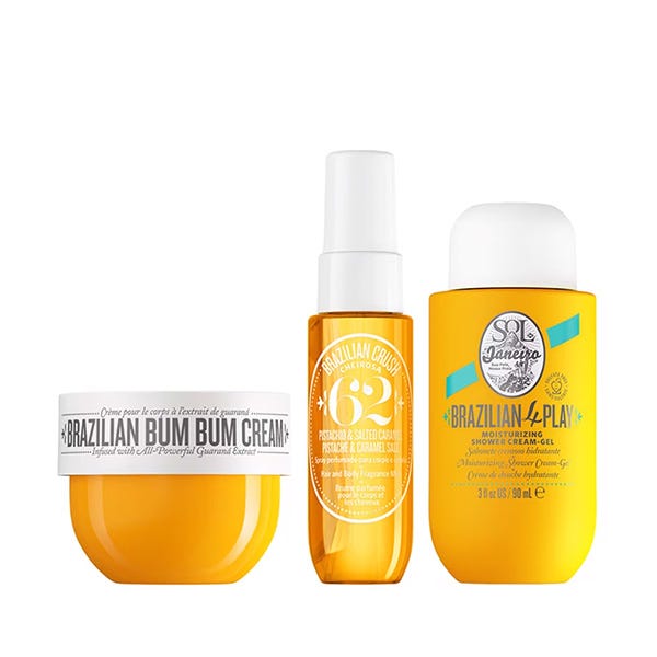 Estos productos de culto en formato mini: la legendaria crema corporal Bum Bum, el gel de ducha en crema Brazilian 4 Play y la bruma perfumada Brazilian Crush, para pulverizar de pies a cabeza y saborear sus embriagadoras notas de pistacho y caramelo salado.