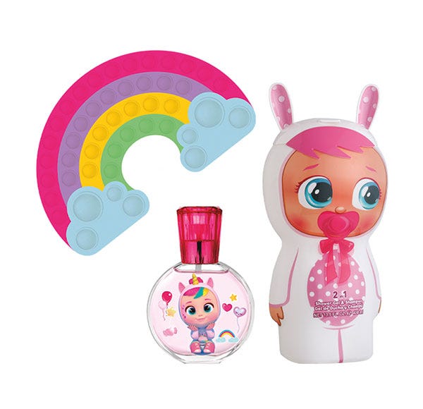 El estuche de Bebés Llorones contiene una fragancia floral en formato 50 ml, gel de ducha y champú 2 en 1 y fidget toy para jugar donde quieras.