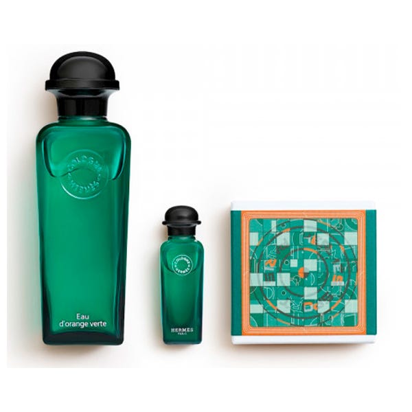El estuche se compone de Eau de cologne Eau d'Orange Verte (100 ml), Eau de cologne Eau d'Orange Verte (miniatura de 7,5 ml) y jabón perfumado (50 g).