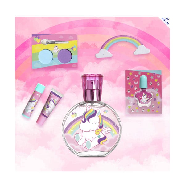 El nuevo estuche de Eau my Unicorn viene acompañado de todo lo que necesitas para una maravillosa aventura. Una fragancia en formato 50 ml con acordes frutales y florales, con dos sombras de ojos, brillo de labios, pintauñas y una lima en forma de arcoíris.