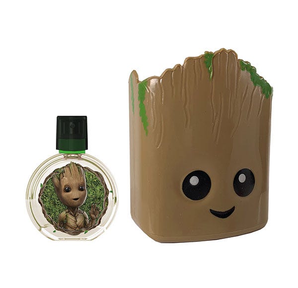 El estuche de Groot contiene una fragancia dulce con notas de vainilla en formato 50 ml y un adorable portaobjetos para organizar y decorar tu mesa de estudio.