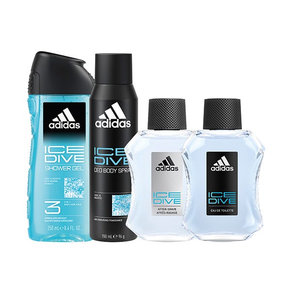 Contiene la fragancia Adidas Ice Dive Eau de Toilette de 100ml, Desodorante 150ml, Gel de Ducha 250ml y After Shave 100ml.