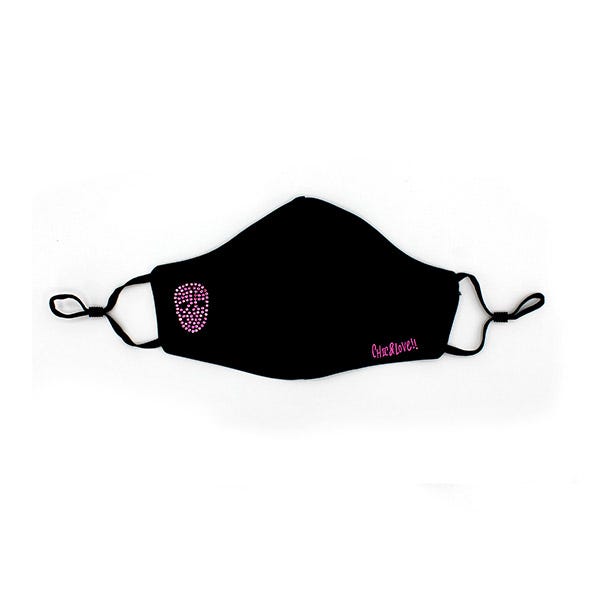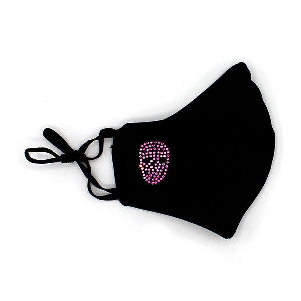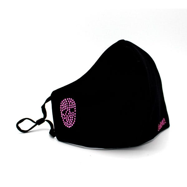 Estuche Mascarilla Calavera que incluye una mascarilla reutilizable con cristales de Swarovski rosas que forman el dibujo de una calavera y un porta mascarillas.