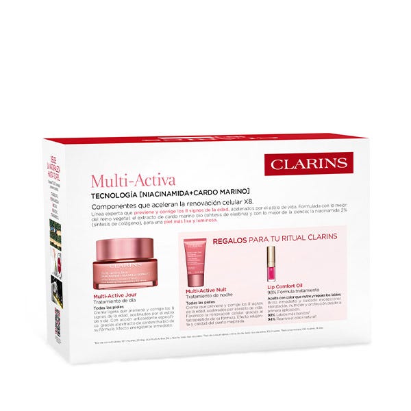 El Cofre Experto Otoño 2025 Multi-Activa Todas las Pieles de Clarins está formulado con niacinamida y cardo marino bio para combatir los primeros signos de la edad y reforzar la luminosidad. Incluye Multi-Active Jour Todas las Pieles 50 ml, que hidrata, alisa y aporta energía al rostro, corrigiendo las primeras arrugas, Multi-Active Nuit 15 ml, que regenera y revitaliza durante la noche para despertar con una piel más lisa y descansada, y Lip Perfector 5 ml, el tratamiento embellecedor que hidrata, repara y aporta brillo con volumen natural a los labios. Un ritual experto que protege la piel frente al estrés diario y ayuda a mantenerla más joven y luminosa, presentado en un estuche exclusivo de edición limitada.