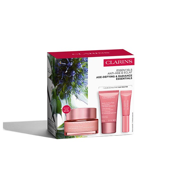 El Cofre Multi Activa de Clarins reúne una rutina completa para prevenir y corregir los primeros signos visibles de la edad y el cansancio asociados al ritmo de vida intenso, combinando la crema Multi Activa Día en tamaño 50 ml con una crema Multi Activa Noche de 15 ml y el icónico Lip Perfector de 5 ml, para mejorar el aspecto de las líneas de expresión, afinar la textura de la piel y potenciar la luminosidad día tras día, gracias a una fórmula experta que ayuda a proteger la piel frente al estrés oxidativo y a los agresores del entorno urbano mientras aporta hidratación, confort y un acabado fresco, dejando el rostro visiblemente más liso, descansado y radiante, y los labios con un efecto embellecedor inmediato, convirtiéndose en un cofre de regalo perfecto para mujeres que buscan un tratamiento antiedad inicial eficaz, una crema facial para primeras arrugas y una rutina diaria y nocturna fácil de integrar.
