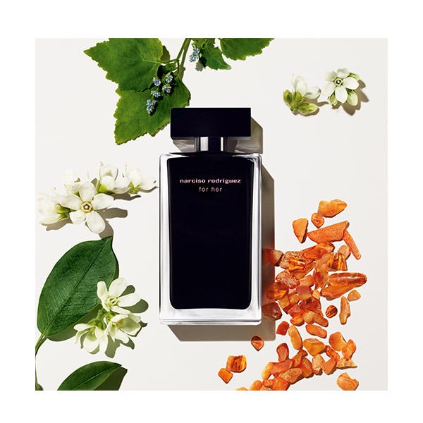 El eau de toilette Narciso Rodriguez for her presenta una cautivadora mezcla de cálidas notas florales, resaltadas por notas de osmanto. El corazón de almizcle está envuelto en un cremoso acorde de ámbar y vainilla, con notas amaderadas que realzan su sensualidad para crear una fragancia adictiva.