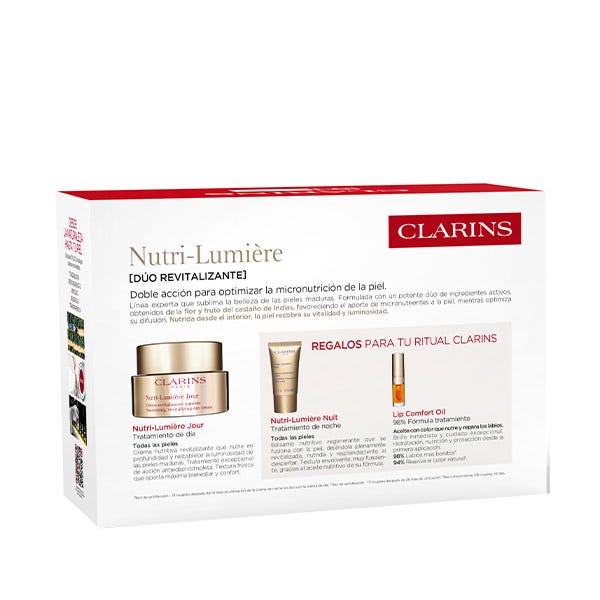 El Cofre Experto Otoño 2025 Nutri-Lumière Revive de Clarins está enriquecido con el Complejo Revitalizante Luminosidad, que combina extractos de flor y fruto de castaño de Indias bio para optimizar la microcirculación y devolver vitalidad a la piel. Incluye Nutri-Lumière Revive Jour 50 ml, crema de día que nutre intensamente, mejora la firmeza y revitaliza el tono apagado, Nutri-Lumière Nuit 15 ml, tratamiento de noche que regenera y aporta confort durante el descanso, y Lip Perfector 5 ml, el embellecedor de labios que hidrata, repara y aporta brillo con volumen natural. Un ritual completo para pieles maduras que buscan nutrición, vitalidad y luminosidad, presentado en un elegante estuche de edición limitada.