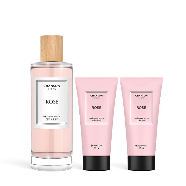 El set de regalo ROSE de la colección Les Eaux du Monde de Chanson D’Eau, incluye Eau de Toilette 100ml, junto con un Gel de ducha y Body Lotion de 50ml.