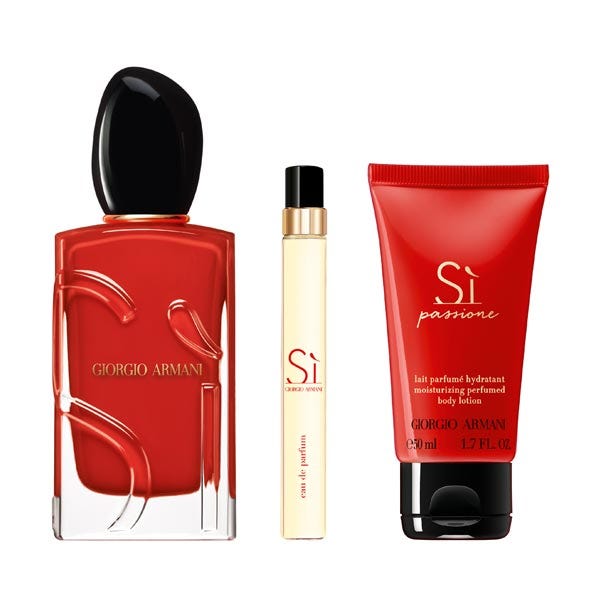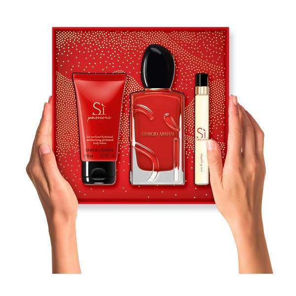 Celebra la temporada con el Cofre de Navidad Sì Passione Eau de Parfum de Giorgio Armani, una edición limitada diseñada para mujeres apasionadas que dicen sí a la vida con fuerza y emoción. Este set incluye: Sì Passione Eau de Parfum 100 ml, Loción Corporal 50 ml y una Mini Talla de 10 ml, perfecta para llevar contigo.