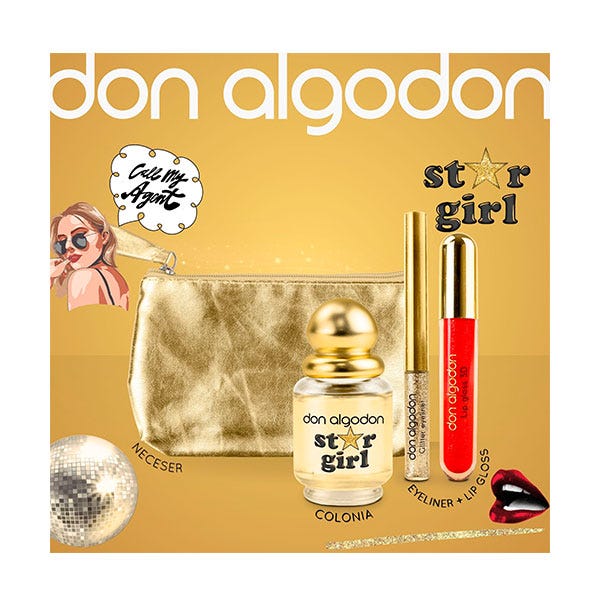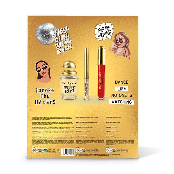 Brilla con el Set de Regalo Star Girl de Don Algodón. Incluye la fragancia Star Girl 30 ml, un 3D Lipgloss rojo, un eyeliner glitter y un neceser metalizado. El set perfecto para mujeres que quieren destacar con estilo.