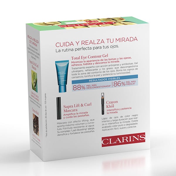 El Cofre Ojos Total Eye Blue Gel de Clarins ofrece un tratamiento innovador para combatir bolsas y ojeras con un efecto refrescante inmediato. Incluye el nuevo Total Eye Blue Gel 20 ml, formulado con extractos vegetales que hidratan, descongestionan y revitalizan el contorno de ojos, aportando luminosidad y descanso a la mirada. Se acompaña del SOS Lashes Serum Mascara 3 ml en tamaño mini, un sérum de pestañas en tono caramelo enriquecido con Lash Boosting Complex, aceite de ricino orgánico y extractos de avena y lentisco, que nutre, fortalece, alarga y aporta volumen visiblemente a las pestañas.