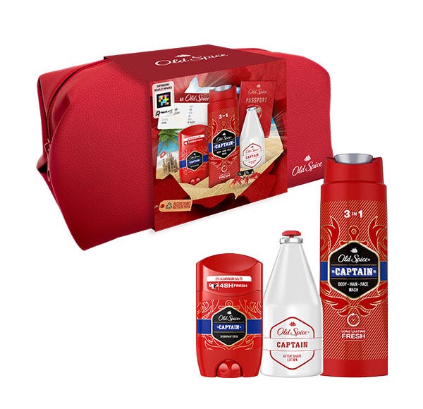 El set de regalo Traveller de Old Spice contiene el desodorante en barra, el gel de ducha y la loción aftershave Captain en un neceser de la marca Old Spice, que se puede reutilizar para llevar tus artículos de aseo a entrenar o de viaje.