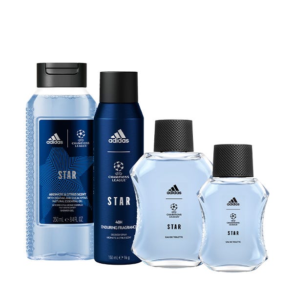 Adidas UEFA STAR es una fragancia fresca de larga duración con notas de naranja, salvia y pimienta negra. Con un aroma cítrico aromático y de larga duración que te aporta frescura durante todo el día. La fórmula vegana está hecha con aceites esenciales naturales de naranja y salvia. Además, junto al gel de ducha Uefa Star podrás liberar todo tu potencial en tu día a día. Es un gel de ducha que proporciona un cuidado óptimo y una sensación refrescante gracias a su fórmula también basado en aceites esenciales de naranja y eucalipto. Un gel con esencia fresca y duradera, dedicado a todos los amantes del fútbol.