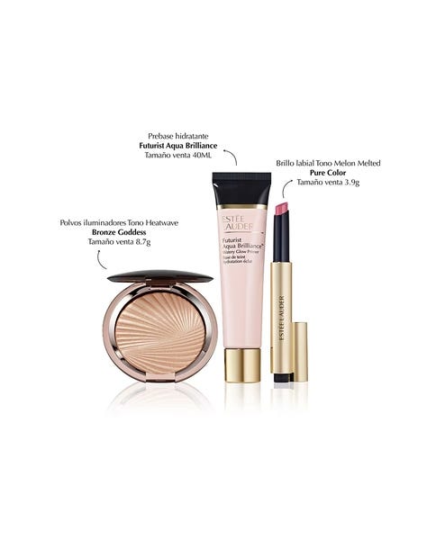Este estuche tiene: Prebase *Futurist Aqua Brilliance:tm:** Watery Glow, tamaño de venta (1.35 oz./40 ml) Gel de polvos iluminadores *Bronze Goddess**, tamaño de venta (0,31 oz/8,7 g) en Heatwave (perla de champán suave con oro luminoso). Brillo labial de efecto fundido *Pure Color**, tamaño de ventas (0,11 oz./3,1 g) en 390 Melon Melted (rosado claro fresco con subtonos neutros y un acabado brillante de espejo).