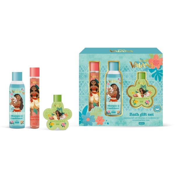 ¡Convierte la hora del baño en una aventura tropical! Este llamativo set de regalo de 3 piezas incluye todo lo que los pequeños exploradores necesitan para sentirse frescos y fabulosos: un suave champú y gel de ducha 2 en 1, un gel de baño brillante y unas divertidas sales de baño. Con una divertida fragancia tropical y presentado en un envase de Vaiana llamativo y colorido, ¡es perfecto para mimarse a diario o como un alegre regalo!