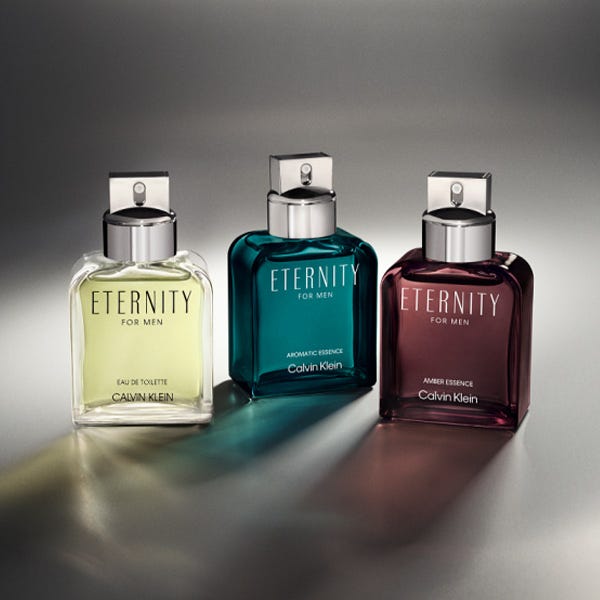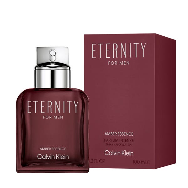 Las líneas icónicas y elegantes de Calvin Klein ETERNITY para hombre se reinterpretan en ETERNITY AMBER ESSENCE Perfume Intense para hombre con un frasco color burdeos intenso con acabados plateados metálicos.