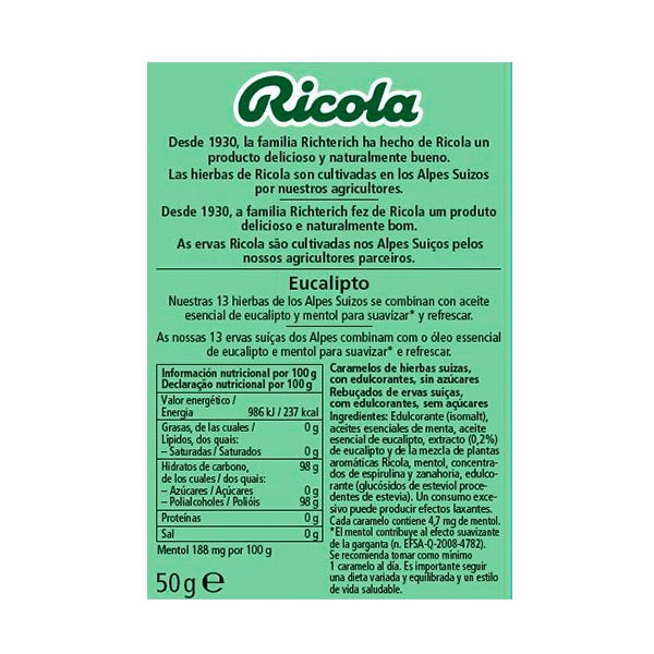 Junto con el mentol, los extractos de eucalipto mejoran la mezcla de 13 hierbas. Los caramelos de eucalipto de Ricola proporcionan un aliento fresco.