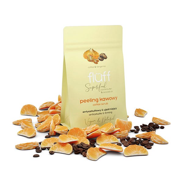 Fórmula de peeling seco reafirmante y anticelulítico con ingredientes 100% de origen natural: café robusta natural con azúcar moreno, semilla de fresa y vitamina E, aceite de almendras dulces y aceite de aguacate.