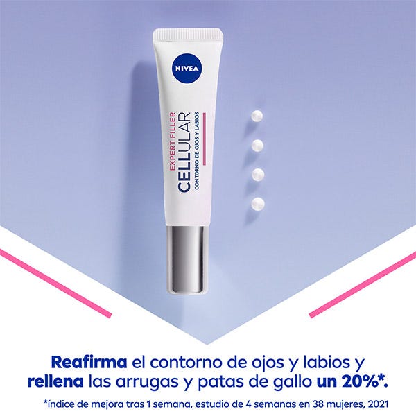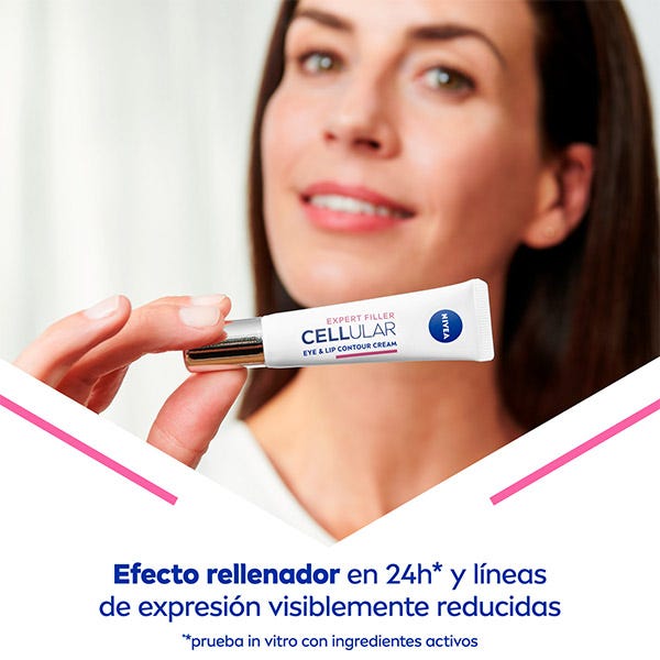 NIVEA Cellular Expert Filler Contorno de Ojos y Labios está enriquecido con Ácido Fólico puro y dos tipos de Ácido Hialurónico, poderosos activos antiedad que aportan un efecto rellenador en 24 horas*. Reafirma el contorno de ojos y labios y rellena las arrugas y líneas de expresión. El Ácido Fólico puro aporta nueva vida a las células de la piel y ayuda a reparar sus fibras*, promoviendo una piel más firme y rellena. Contiene Micro y Macro Ácido Hialurónico, dos ingredientes antiedad conocidos por rellenar las arrugas eficazmente, alisar la piel e hidratar intensamente. Al instante, la piel se siente tonificada. En 1 semana, la zona de los ojos y labios se siente más firme, reduciéndose las arrugas y patas de gallo visiblemente. En 4 semanas, el contorno de ojos se redensifica y rejuvenece. *Testado en células de la piel