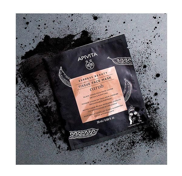 La mascarilla de tela negra con carbón activo vegetal y sérum de algarroba, el fruto de un árbol nativo del Mediterráneo, que se conoce como la alternativa saludable del cacao.