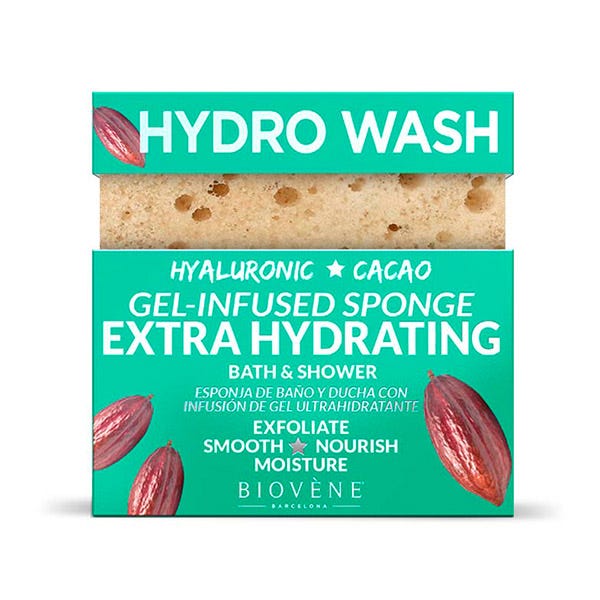 Esponja de baño y ducha multifuncional ultrahidratante infundida con ácido hialurónico intensamente hidratante, cacao y aceite de semilla de uva que nutre, exfolia y suaviza la piel al instante.