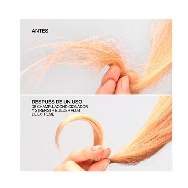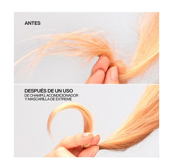 Al mismo tiempo, refuerza y repara la estructura del cabello. No aporta peso.
