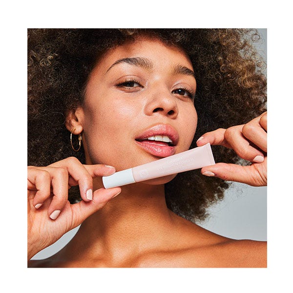 Gire la parte superior a "Encendido" y presione ligeramente el tubo. Luego aplica un par de puntos debajo de los ojos con la esponja incorporada y difumina con las yemas de los dedos, una brocha o una esponja mezcladora.