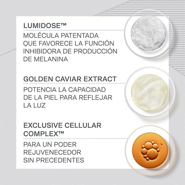 • La infusión de Extracto de Caviar dorado aumenta la producción de colágeno y redensifica la matriz extracelular para refinar la forma de los ojos y optimizar la luminosidad de la piel.