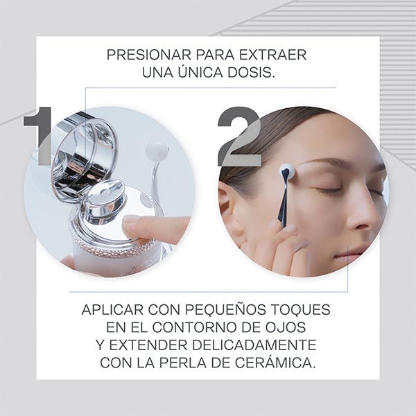 Por la mañana y por la noche, extender una pequeña cantidad en la zona del contorno del ojo y realizar un masaje delicado hasta su completa absorción.