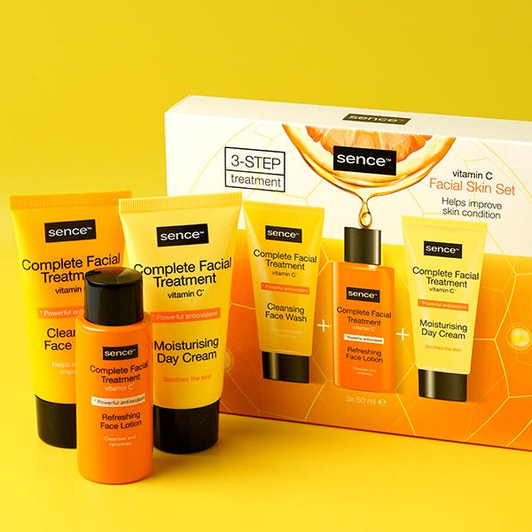 Este set de regalo de Sence Vitamina C es un tesoro para tu piel, con un Limpiador Facial de 50 ml, una Loción Facial Calmante de 50 ml y una Crema Hidratante de Día de 50 ml.