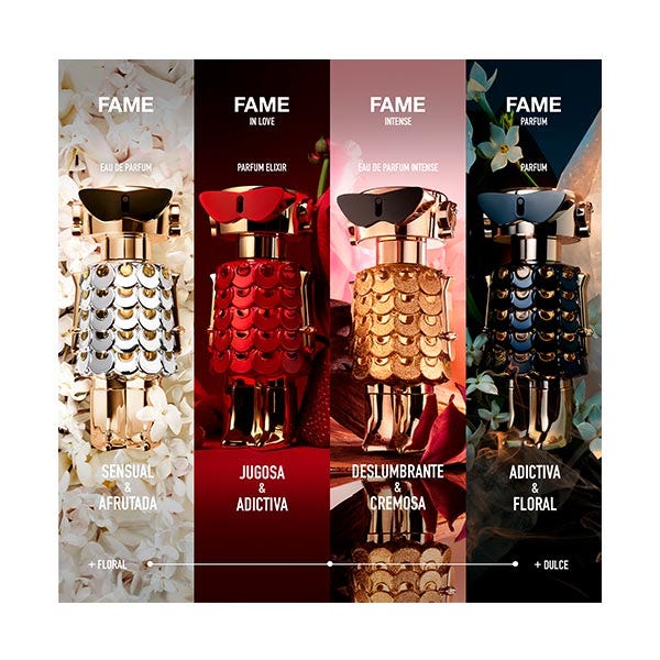 Verdaderamente. Locamente. Profundamente enamorada. FAME se enamora perdidamente de FAME IN LOVE Parfum Elixir. La firma femenina más deliciosa de FAME, con el inconfundible giro de Rabanne. Un extracto súper jugoso de fresa que transforma la intensa fragancia amaderada, afrutada y floral en un nuevo y juguetón lenguaje del amor, pensado para la It-girl parisina definitiva. FAME IN LOVE forma la pareja de poder perfecta junto al nuevo PHANTOM IN RED Parfum Elixir.