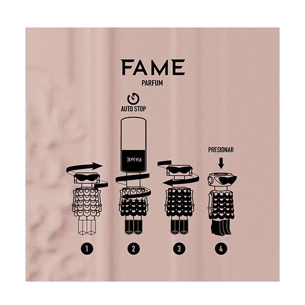 Inspirado en los legendarios códigos de la alta costura de Rabanne y en su emblemático vestido de cota de malla, Fame Parfum se viste con un nuevo y seductor objeto de deseo. Tan valioso como una joya; tan emblemático como siempre: el perfume con el frasco dorado característico de Fame se viste de gala con un brillante vestido en la parte posterior a juego con la intensidad de la fragancia de oro champán que atesora en su interior.
