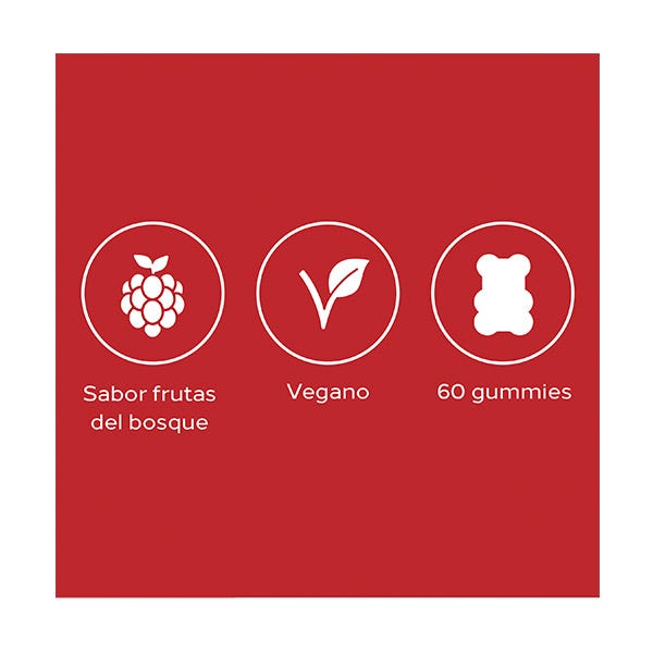 Incluye 60 gummies. Sabor frutas del bosque. Sin Gluten. Sin Lactosa. Vegano.