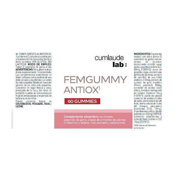 Contenidos medios por dosis diaria (2 caramelos de goma): azúcar, jarabe de glucosa, edulcorante: eritritol, agua, ácido L-ascórbico (vitamina C: 80mg [100%*]), zumo de grosella negra concentrado, gelificante: pectinas, extracto de semillas de uva (Vitis vinifera L.): 65mg, extracto de corteza de pino marítimo (Pinus pinaster): 50mg, corrector de acidez: ácido cítrico, levadura enriquecida en selenio (selenio: 55μg [100%*]), aceite de girasol, corrector de acidez: citratos de sodio, aroma natural de tutti frutti, aroma natural de frutas del bosque, ubiquinona (coenzima Q10: 10mg), D-pantotenato cálcico (ácido pantoténico: 6,0mg [100%*]), colorante: antocianinas y colecalciferol (vitamina D3: 10μg [200%*]). VRN: Valores de Referencia de Nutrientes.