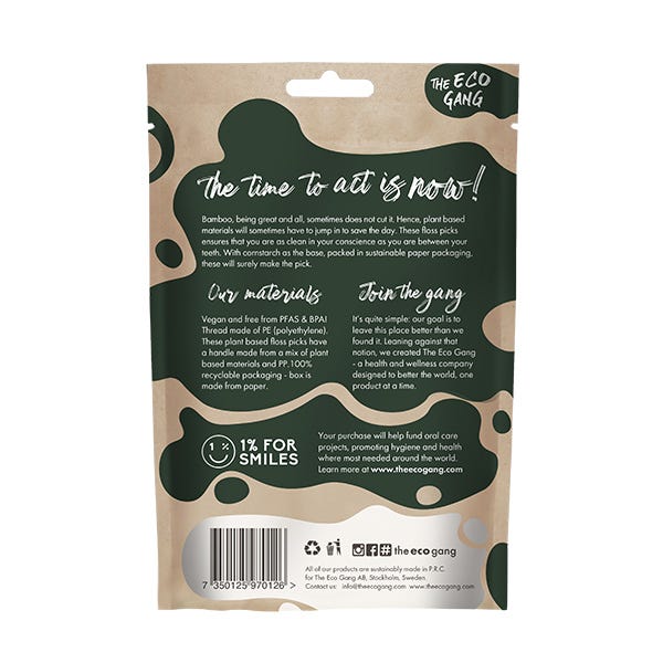 El Eco Gang Floss Pick Carbon está fabricado con materiales de alta calidad y respetuosos con el medio ambiente. El mango está hecho de almidón de maiz, un material sostenible y biodegradable. El hilo dental está impregnado con carbón activado, que ayuda a eliminar las manchas y mantener los dientes blancos y brillantes.